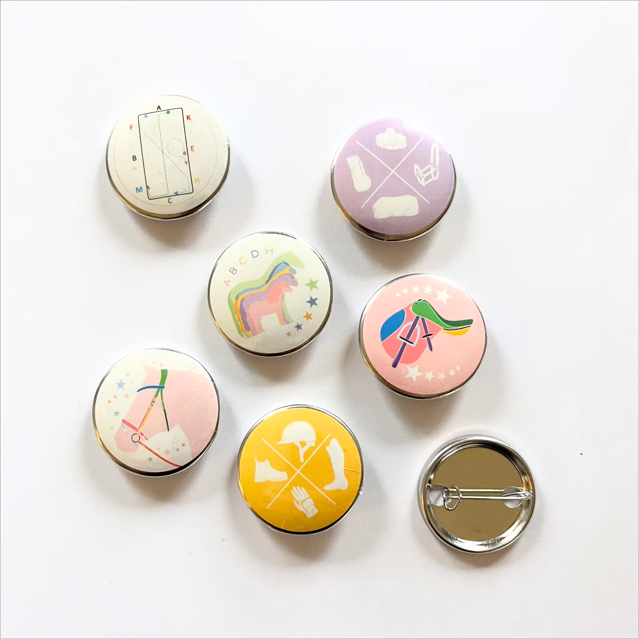 De är 32 mm i diameter, gjorda i metall och fästs med nållåsning/säkerhetsnål.