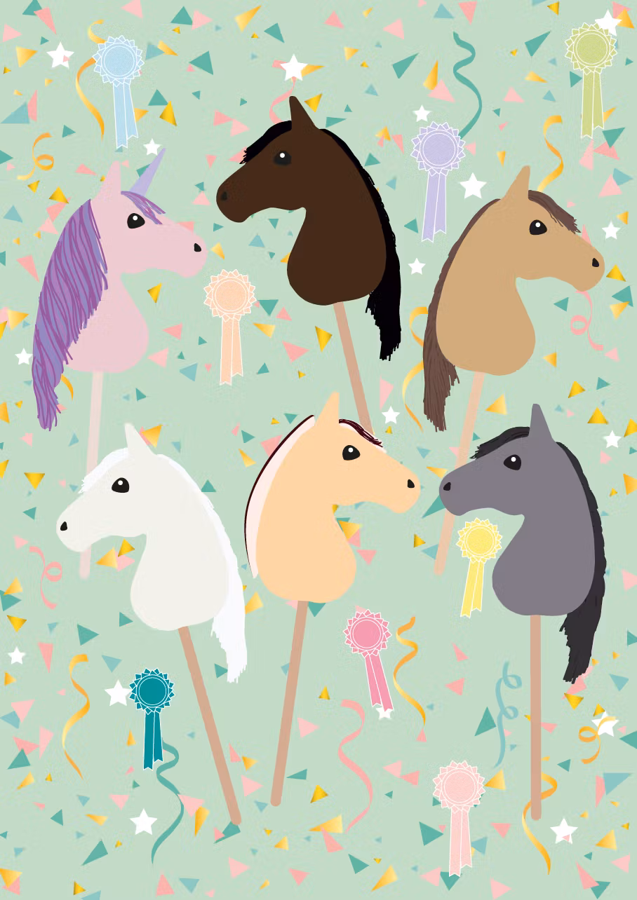 Kort med käpphästmotiv. 10 kort per paket.